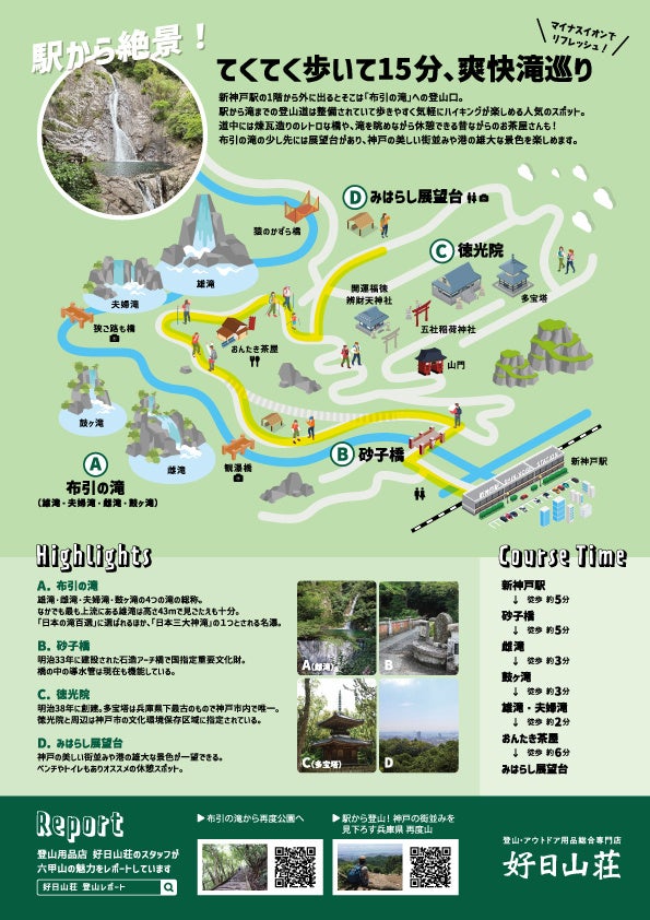 登山・アウトドア・クライミング用品総合専門店、クライミングジムを運営する株式会社好日山荘(本社:兵庫県神戸市、代表取締役社長 池田 真吾)は、8月25日(木)~10月31日(月)まで、JR西日本と共同で神戸市にある新神戸駅から近い布引の滝を中心とした六甲山エリアでのハイキングの魅力をディスプレイにより発信いたします。