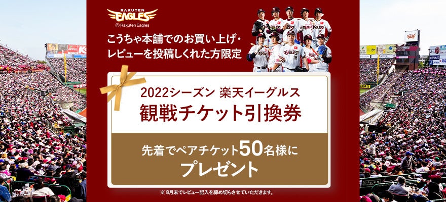 楽天市場 こうちゃ本舗にて紅茶の販売を手がける株式会社タチバナ産業(東京都台東区、代表取締役 野原将彦)は、楽天イーグルス2022シーズンオフィシャルスポンサー記念キャンペーンとして、2022シーズン楽天イーグルス観戦ペアチケット引換券を、楽天市場こうちゃ本舗でお買い上げ・レビューを投稿いただいた方限定に、先着でペア50名様にプレゼントいたします。この機会に是非、当店自慢の商品をお試しください。