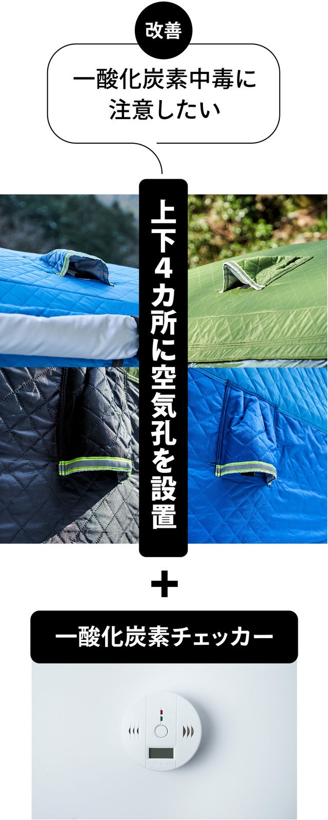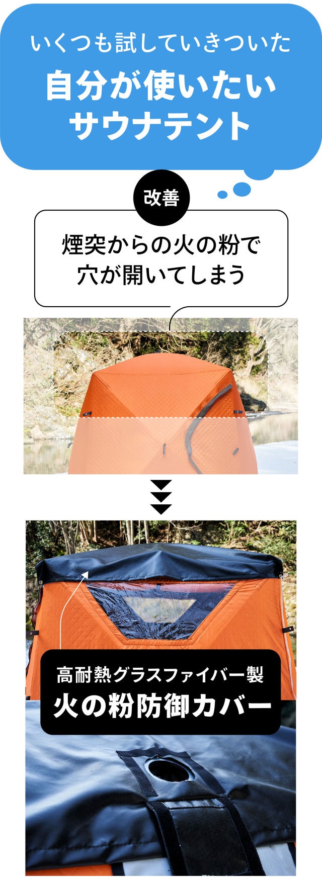 安心、安全なサウナを追い求めるために我々は以下の点を改善しました。先ず火の粉でテントに穴を開くのを防ぐ火の粉防御カバーの開発。一酸化炭素中毒も未然に防ぐために4つの換気口を設け、さらにCOチェッカーも標準装備といたしました。