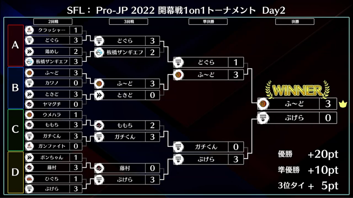 - 「ストリートファイターリーグ: Pro-JP 2022 開幕戦 1on1トーナメント」優勝は「名古屋OJA BODY STAR Mildom」ふ~ど選手!