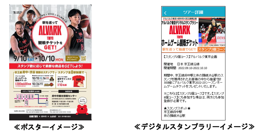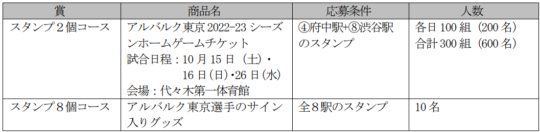京王線の府中市所在駅(武蔵野台駅・多磨霊園駅・東府中駅・府中駅・分倍河原駅・中河原駅・府中競馬正門駅)と、井の頭線渋谷駅(アベニュー口)の計8駅に設置された二次元コードをよみとり、府中駅と渋谷駅の2つのスタンプを集めると、アルバルク東京2022-23シーズンホームゲーム観戦チケットが抽選で300組600名様に当たります。また、各スタンプスポットにはそれぞれ異なる選手のポスター及び等身大パネルを設置しており、8駅全駅のスタンプを集めると、アルバルク東京選手のサイン入りグッズが抽選で10名様に当たります。