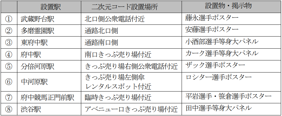 ※④府中駅と⑧渋谷駅には、「スタンプ2個コース」「スタンプ8個コース」2種類の二次元コードがあります。両方の抽選に参加する場合は、両方のスタンプ獲得が必要です。