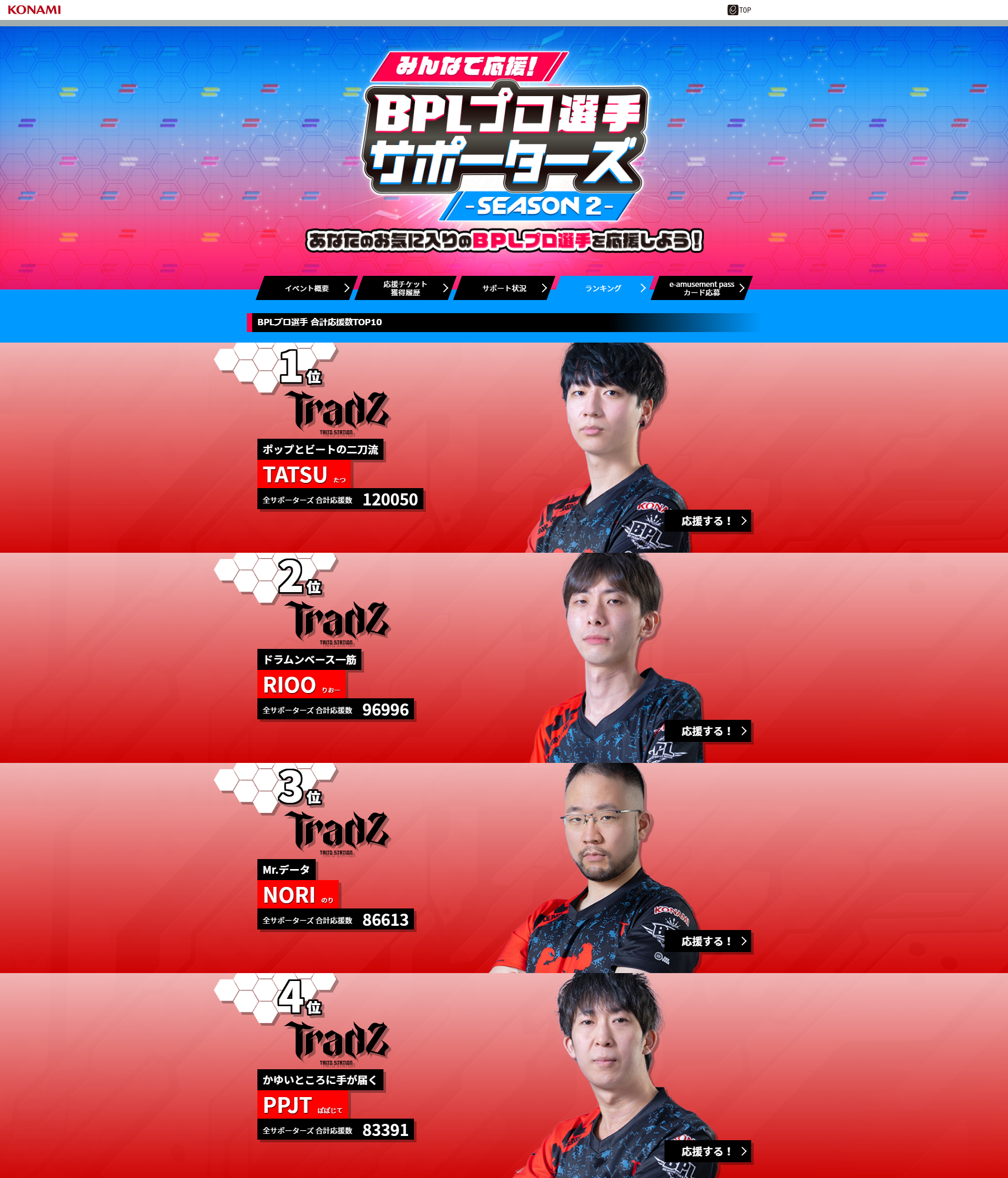 現在開催中の「BPL選手サポーターズ」では、皆様の温かいご支援のおかげで、8月31日時点で1位から4位をTradz選手が独占しています!