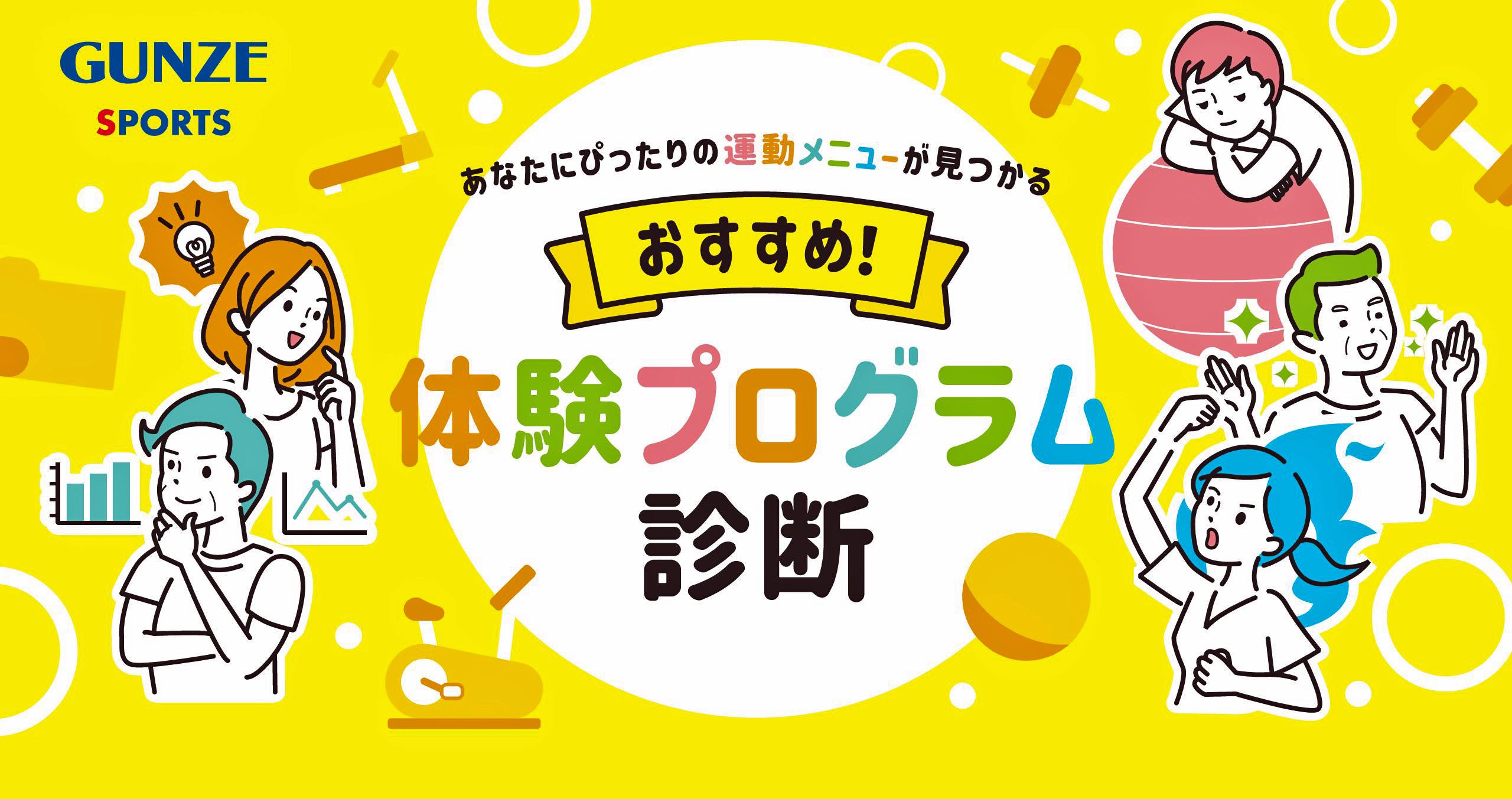 運動をはじめなきゃと思いつつきっかけが作れなかった人も、せっかくトレーニングしていたのに途中でやめちゃった人も、グンゼスポーツがこの秋、運動にチャレンジするきっかけづくりをお手伝いします。まずはあなたにぴったりの運動メニューを見つけて動き出しましょう。