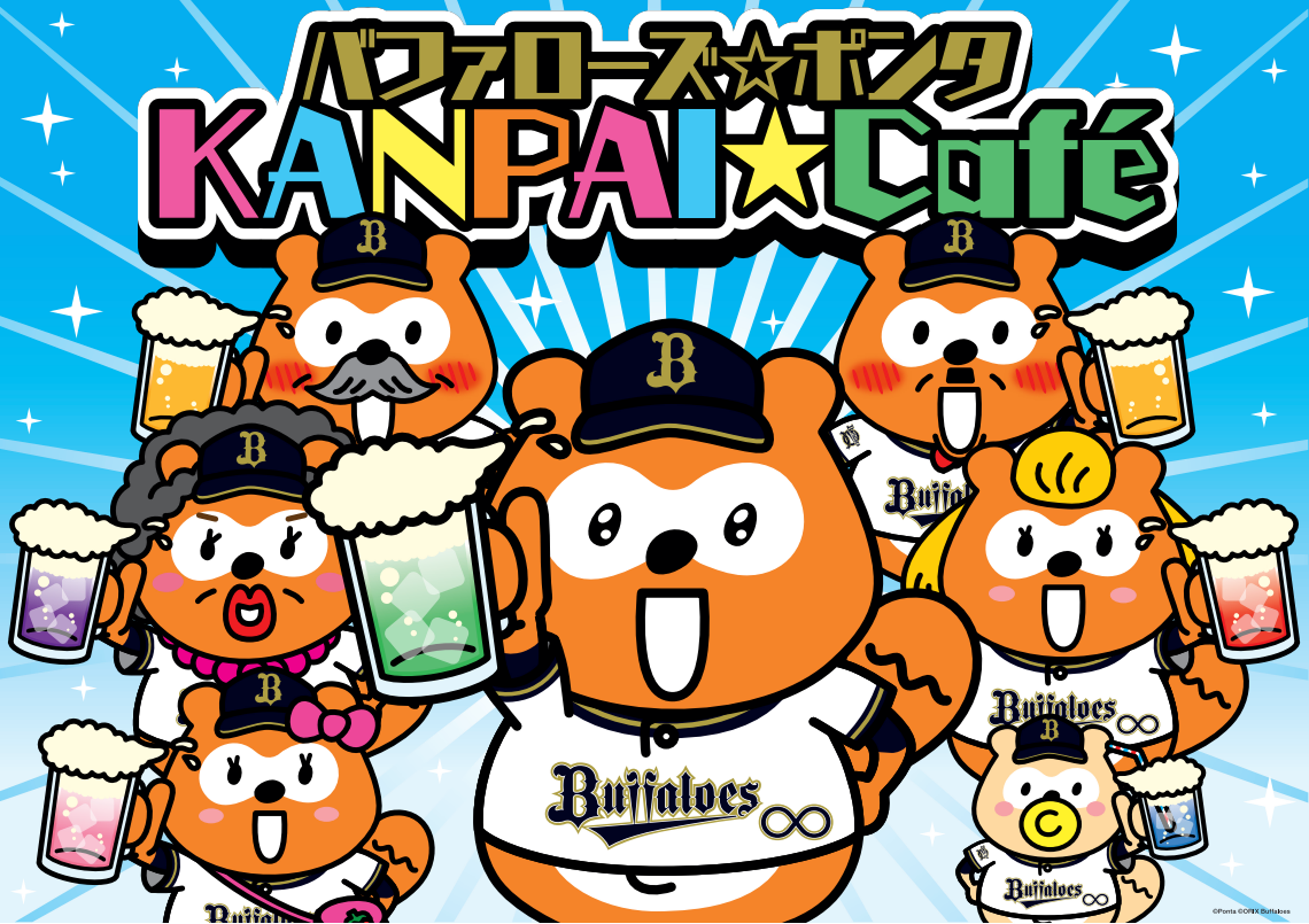 バファローズ☆ポンタは、オリックス・バファローズを全力で応援するツイートを行っています。一緒に喜び、時には一緒に悔しがるコメントをお寄せいただいているファンの皆様への感謝の気持ちを込め、このたび期間限定のカフェを大阪にオープンします。バファローズ☆ポンタをコンセプトにしたカフェの開催は、2017年以来5年ぶりとなります。球団の今シーズンのスローガン「全員でW(わら)おう!!」にかけ、カフェのテーマを「全員でKANPAIしてWおう」としました。バファローズ☆ポンタファミリーが笑顔で乾杯している、楽しげな雰囲気の中でお食事やデザート、ドリンクをお楽しみいただけます。また、カフェデザインの新作グッズを販売します。