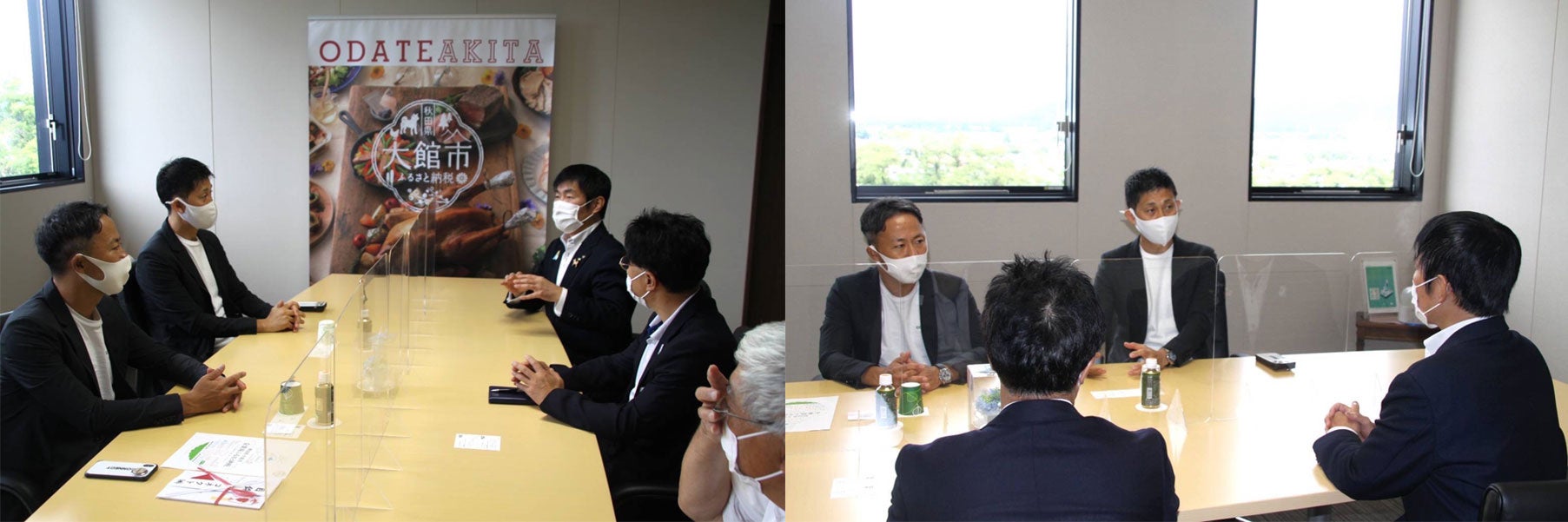 (右から)福原淳嗣 大館市長、コネクトの山田雄亮・百瀬俊介(2022年8月29日 / 大館市役所)