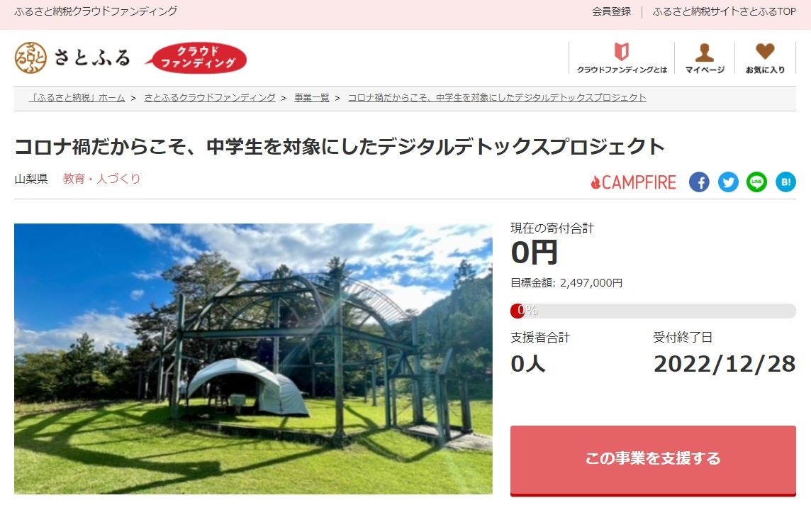 厚生労働省によるとネット依存が疑われる中高生の推計は、2012年の52万人から2017年には93万人へと急増しています。山梨県においても18歳以上を対象に行った調査では、ネット依存が疑われる人の推計は約3万人となり、アルコール健康障害やギャンブルなど依存症の推計値を大きく上回る結果となりました。出生直後からデジタル機器が身近な存在である18歳以下を除いた結果であることを考慮すると早急な対策が求められています。そこで山梨県は、日常生活を見直したい中学生を対象に、医療者によるゲーム・ネット依存に関する講義や農作業などの自然体験活動を行うデジタルデトックスキャンプの開催や、軽運動を発信・推奨するデジタルデトックスプロジェクトを実施するため、寄付を募集します。