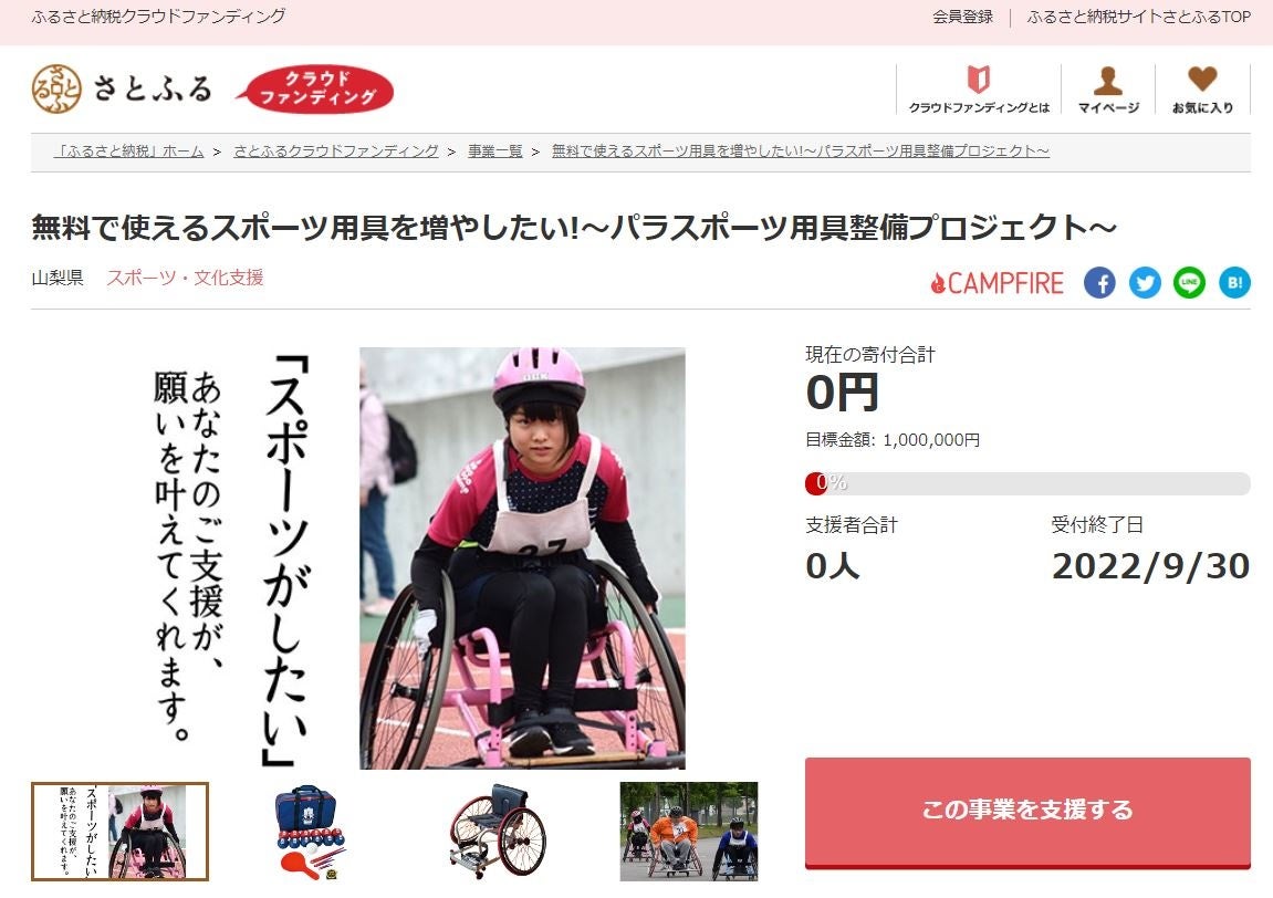 山梨県では多くの人にパラスポーツに親しんでもらうため、山梨県障害者スポーツ協会実施の「障害者スポーツ用具貸し出し事業」への支援として、無料で貸し出しできる用具の整備を行っています。世界大会でパラスポーツへの注目が高まったことなどを受け、近年貸し出し申請件数が増加していますが、用具の数は限られており在庫不足の状況です。また、競技用の用具は高額のため個人で購入するにはハードルが高く、パラスポーツ普及の障壁になっています。そこで山梨県は、貸し出しするパラスポーツ用具を増やすため、寄付を募集します。購入した用具を活用してより多くの人がパラスポーツに触れる機会を増やすとともに、大会や体験会などのイベントを企画してパラスポーツのさらなる普及を図ります。