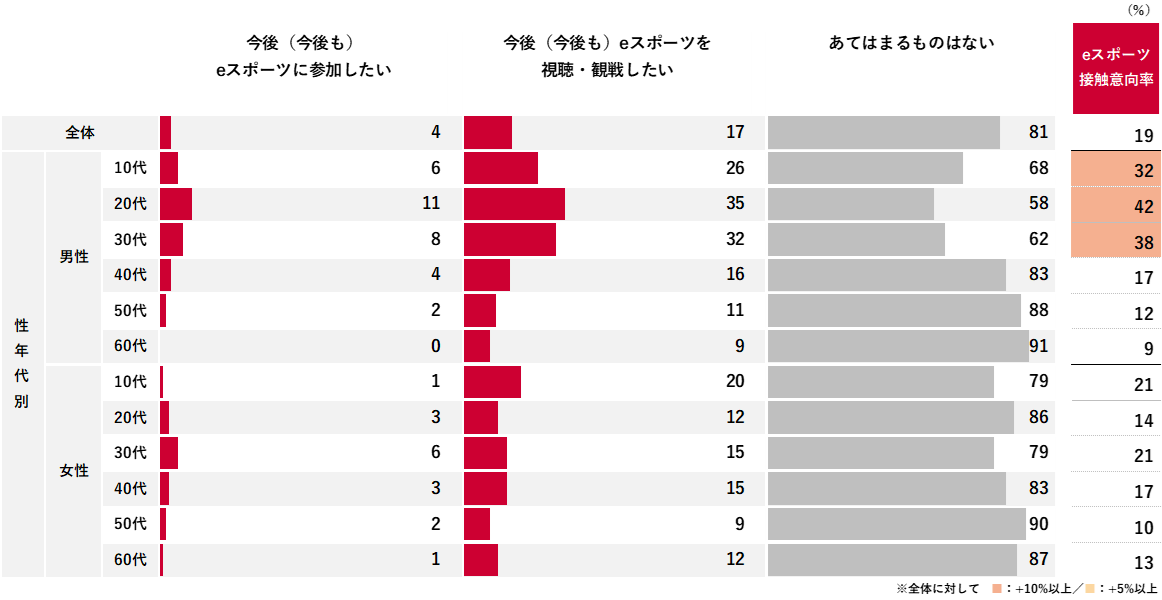 今後の接触意向について「参加」が4%、「視聴・観戦」が17%だった。「あてはまるものはない(81%)」を除いた接触意向率は19%となっており、これまでに接触経験があると回答した16%(接触率)から、3ポイントの増加に留まった。
