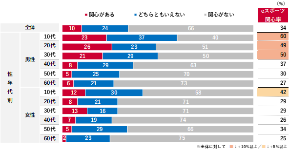 一方、eスポーツへの関心について「関心がある」は10%と、キャズム*を超えない結果となった。性年代別でみると、男性の10代から30代が20%以上と多く、性年代で大きな差が見られた。認知から関心へと意識をつなげることで、これからの市場拡大が期待される。
