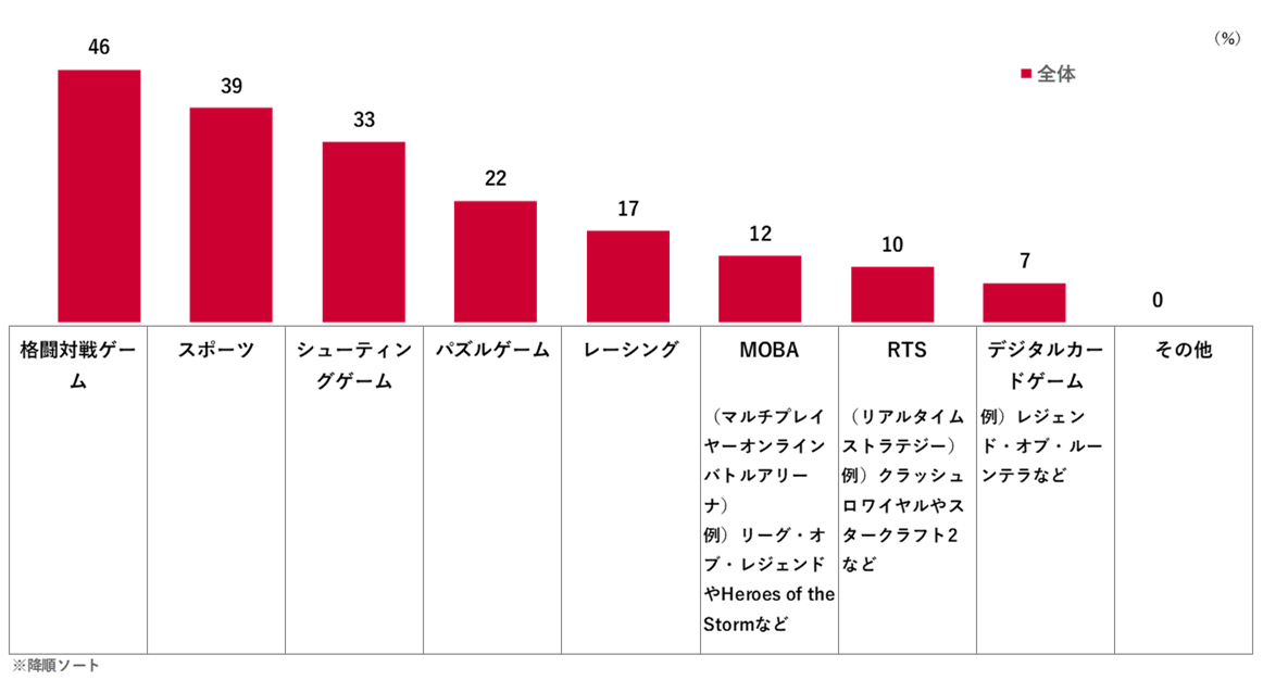参加経験のあるジャンルは「シューティングゲーム(55%)」が最も高く、次いで「格闘対戦ゲーム(53%)」、「スポーツ(49%)」となった。視聴・観戦経験のあるジャンルも上位3つは「格闘対戦ゲーム(46%)」、「スポーツ(39%)」、「シューティングゲーム(33%)」と、参加ジャンルと同様の結果となった。