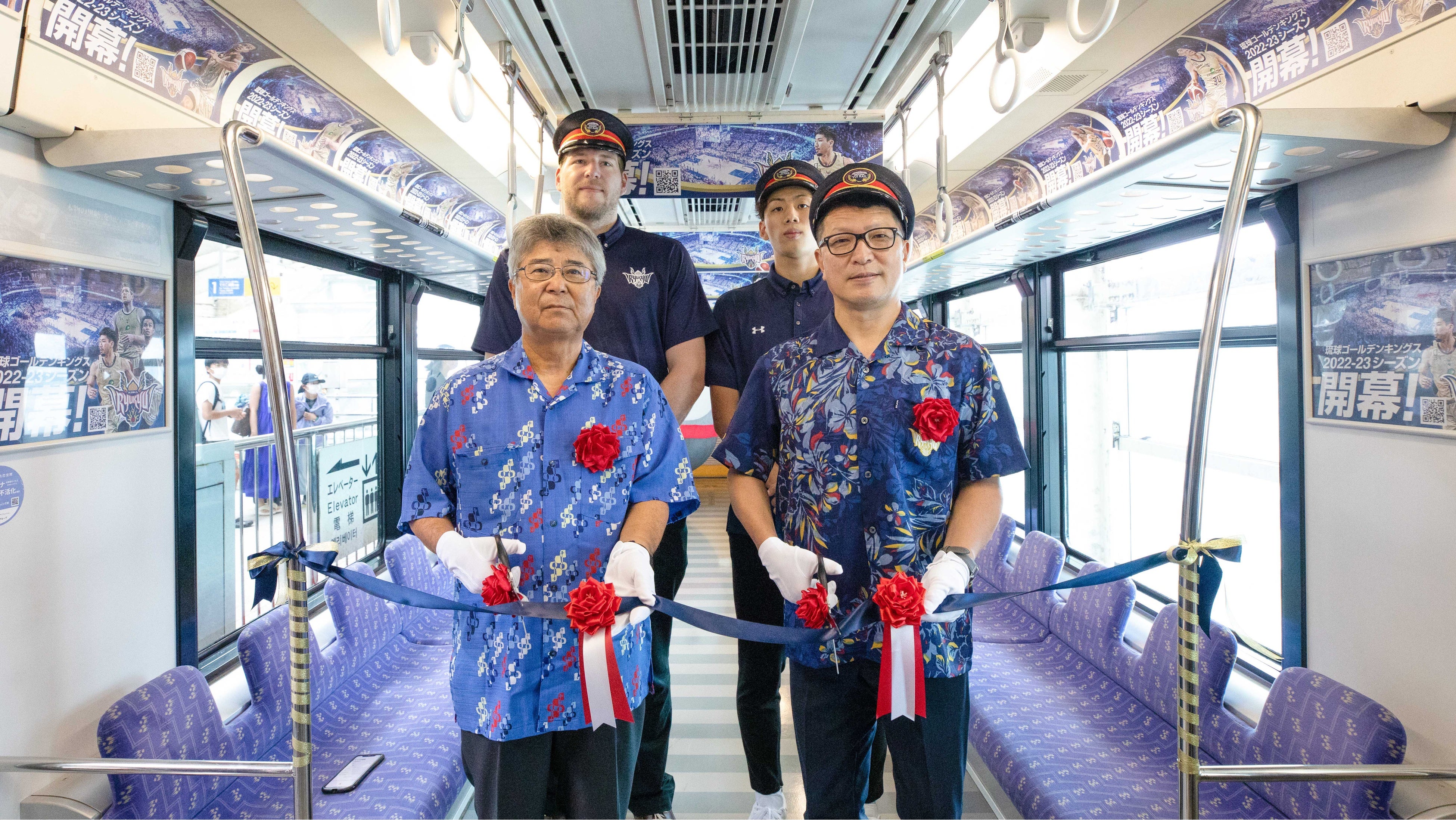 ジャック広告車両の運行に伴い、9月2日(金)に那覇空港駅にて『琉球ゴールデンキングスジャック・モノレール』車両のお披露目式を実施いたしました。この車両では、キングスホームゲームのオフェンス時の音楽も使用されます。