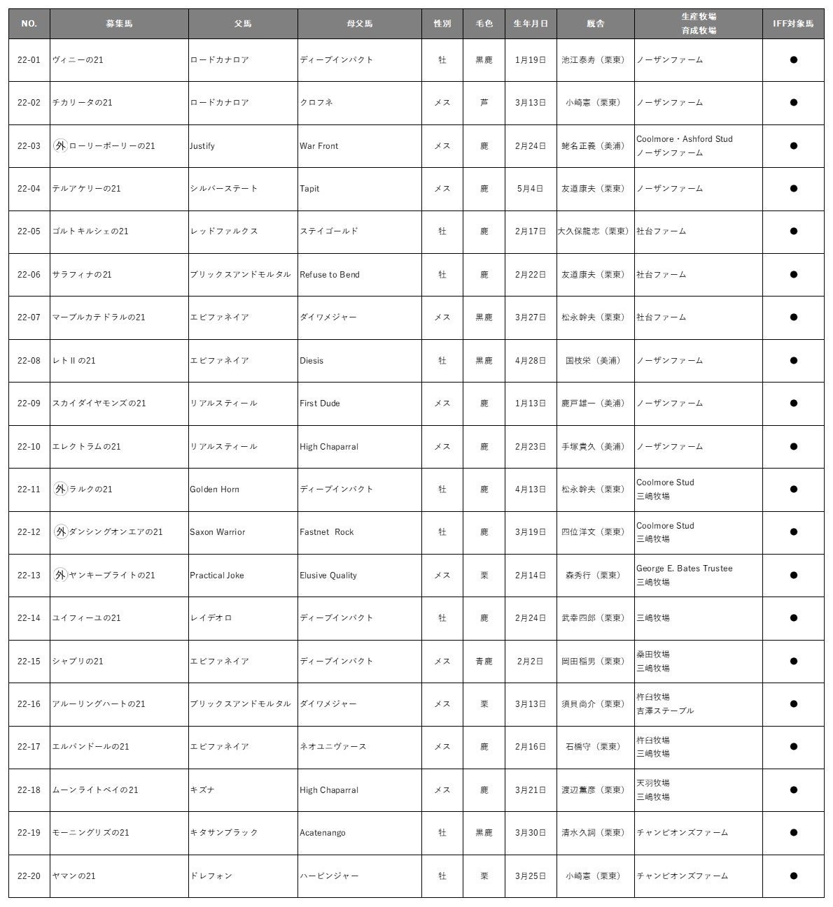 No.22-03 ○外ローリーポーリーの21(父:Justify|厩舎:蛯名正義(美浦)|Coolmore・Ashford Stud生産馬)