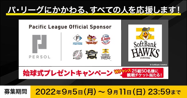 パシフィックリーグマーケティング株式会社(本社:東京都中央区、代表取締役CEO:根岸 友喜)は、2022年度パシフィック・リーグのオフィシャルスポンサーである、総合人材サービスのパーソルホールディングス株式会社(本社:東京都港区、代表取締役社長 CEO:和田 孝雄)とともに、パーソルグループの冠協賛試合「パーソルDAY」の始球式投球権のプレゼントキャンペーンの募集を開始することをご案内いたします。