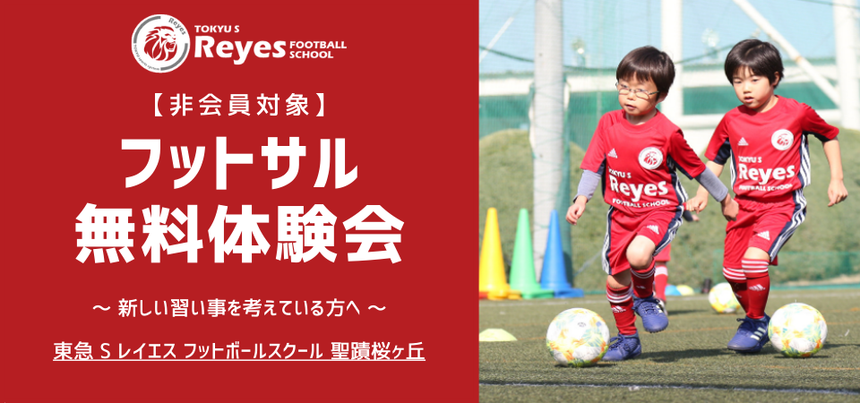 東急Sレイエス フットボールスクール 聖蹟桜ヶ丘では、これからフットボールを始める年中~小学2年生のお子様を対象に、フットサル無料体験会を開催いたします。「初めてだから不安…」・「友達と一緒にプレーできるか不安…」、東急Sレイエスフットボールスクールの明るいコーチたちが優しく、丁寧に指導をするのでご安心ください。皆様のご参加をお待ちしております。
