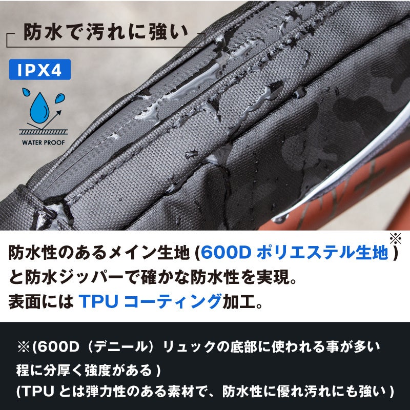 防水性のあるメイン生地(600Dポリエステル生地)と防水ジッパーで確かな防水性を実現。