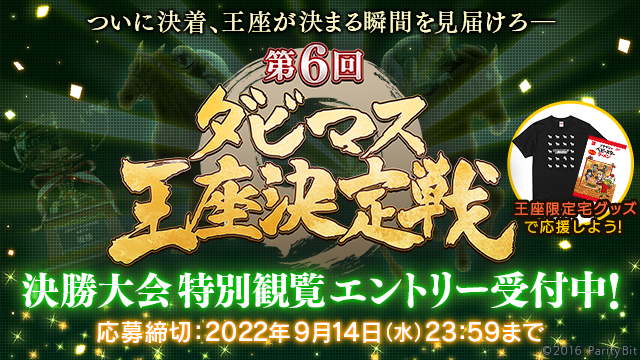 第6回ダビマス王座決定戦 決勝大会に最大100名のZoom会議で参加できる特別観覧枠のエントリーを、本日2022年9月7日(水)12:00から2022年9月14日(水)23:59まで受付中です。