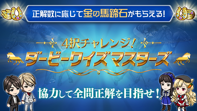 ダビマスに関する4択クイズが出題され、全員で決めた回答の正解数に応じた「金の馬蹄石」を後日全ユーザー様にプレゼントします。