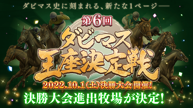 第6回ダビマス王座決定戦 決勝大会進出の決まった全18名の牧場主の中から、優勝すると思う牧場を1名予想し、見事的中したユーザー様には「参加者数×20個の金の馬蹄石を山分け」してプレゼントします。