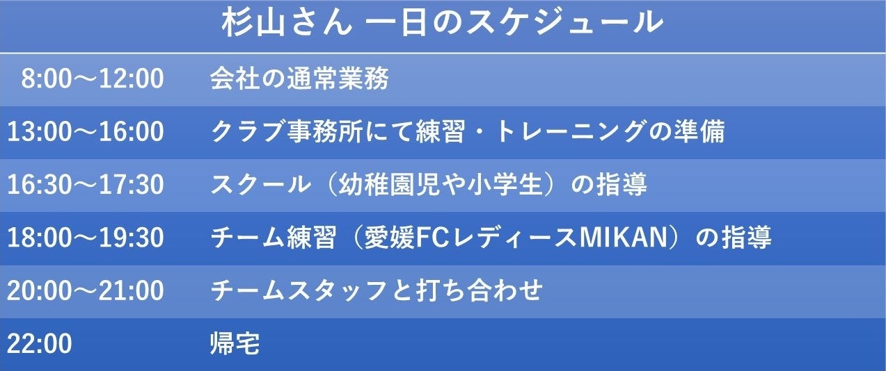 ⽬まぐるしく変化するキャリアの中で、派遣社員として仕事を転々とすることもあったと語る杉⼭さん。コーチングライ センス取得のための勉強をしたいがなかなか時間が取れない、期限付きの雇⽤形態で安⼼感を持ちながら働くことが出来ないなど、⾃⾝のキャリアに悩みを抱えていました。その後ProVisionに⼊社し、現在はフルリモートで仕事をしながら、「愛媛FCレディースMIKAN」のU-18コーチを務めています。平⽇の午前中に会社の業務を⾏い、午後はチーム練習やスクールの指導にあたっています。