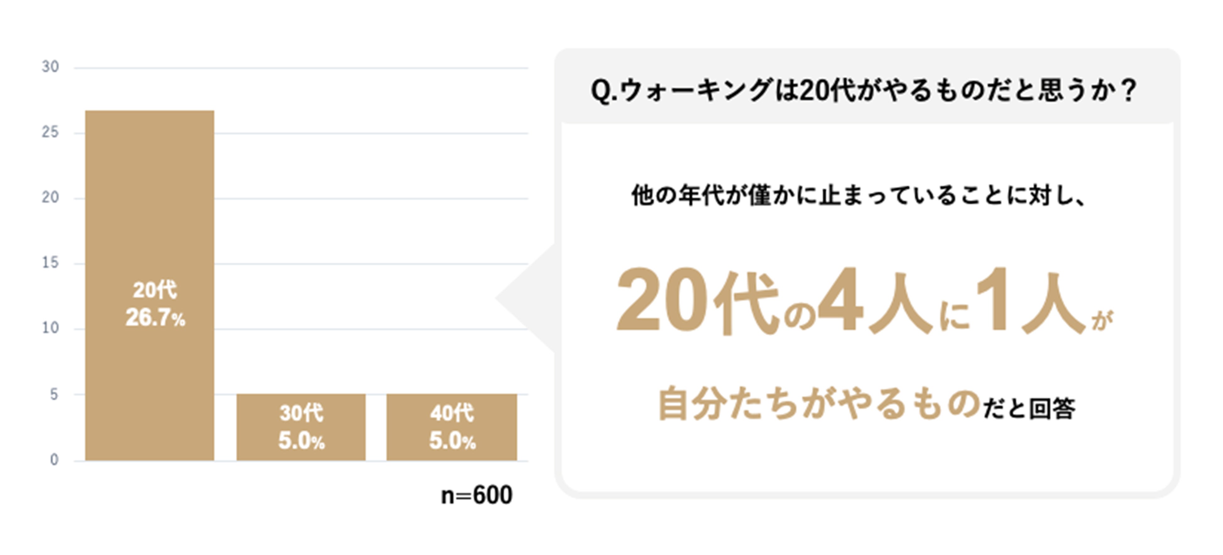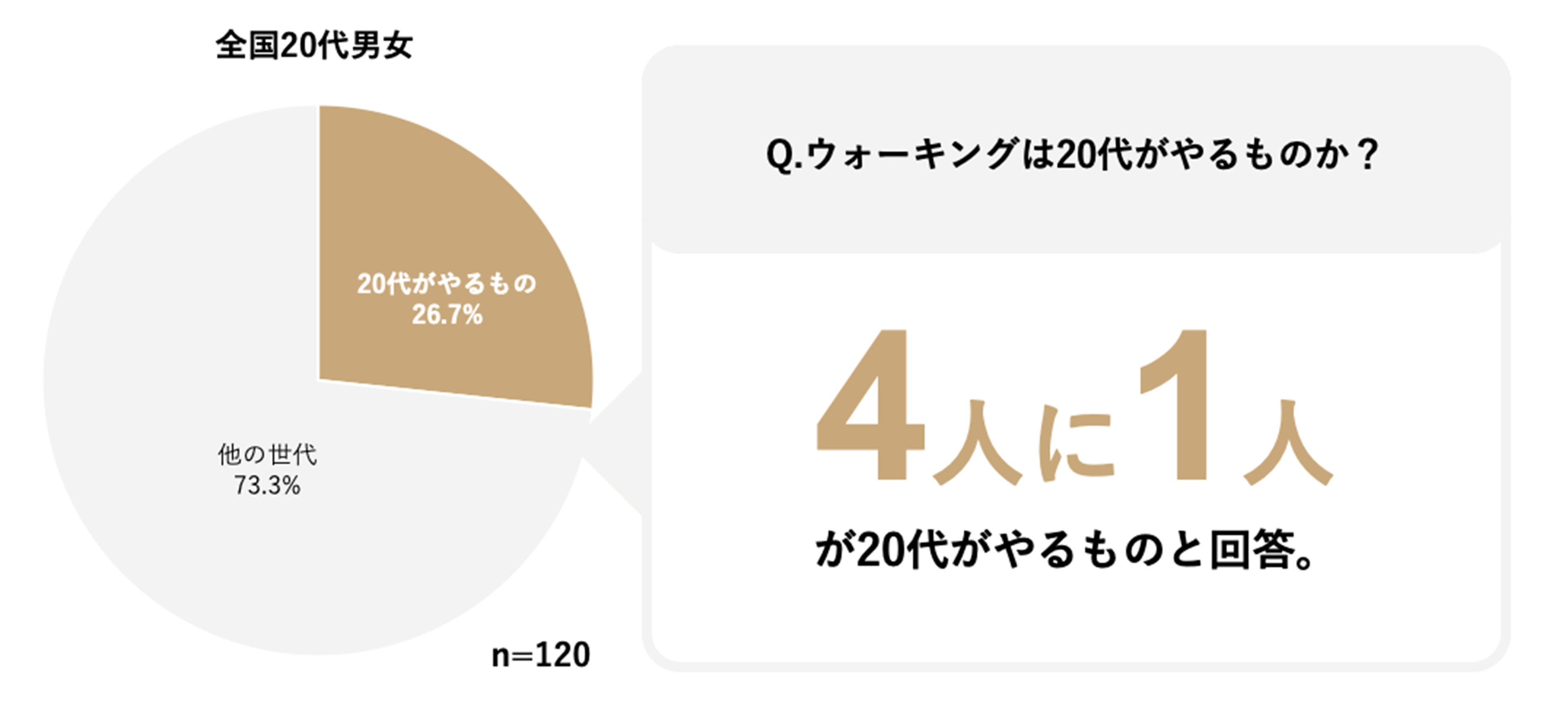 ウォーキングはどの世代がやるものだと思うか、という質問に対して、20代の4人に1人(26.7%)は「ウォーキングは20代(自分たちの世代)がやるもの」と回答。ウォーキングを積極的に自分事化し取り組む意識の存在が明らかになりました。