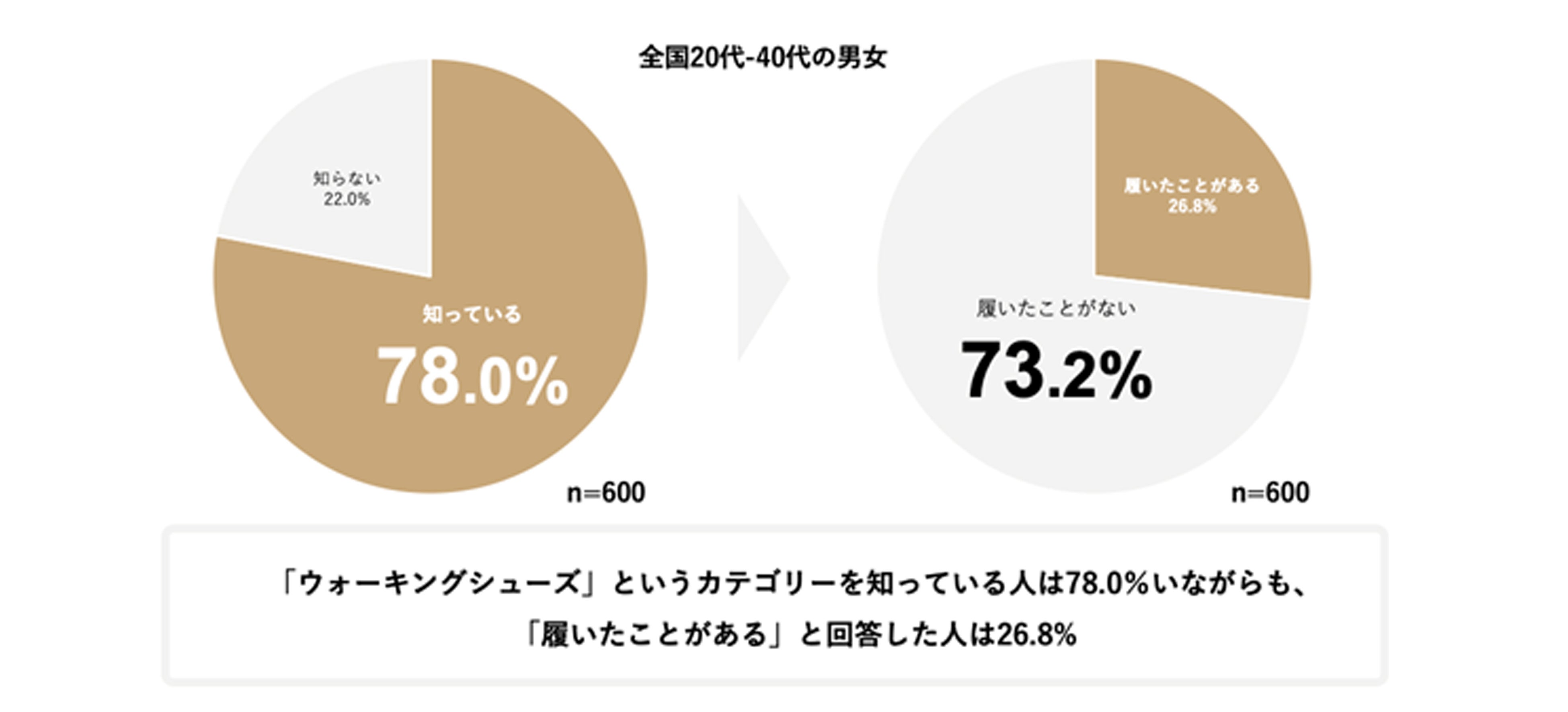 調査対象の全年代で、多くの人がウォーキングをしているという選択肢を選ぶ中で、「ウォーキングシューズ」というカテゴリーを知っている人は78.0%いながらも、「履いたことがある」と回答した人は3割以下にとどまり、今後もより成長の余地があるシューズ領域であることがわかります。加えて重視する内容では履き心地(61.7%)や軽さ(38.3%)に加えてファッション性(18.3%)も重要視していることがわかりました。