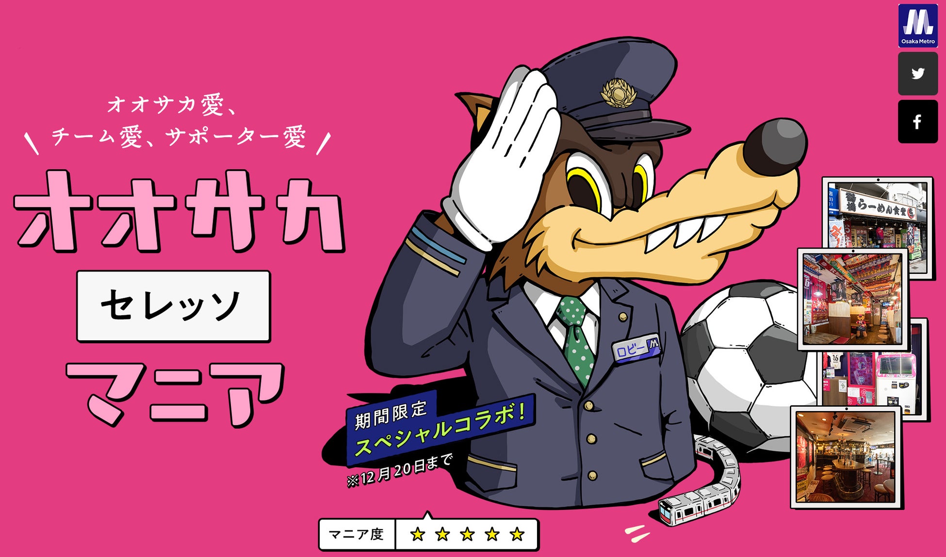 Osaka Metroがお届けするお出かけサイト「オオサカマニア」に「セレッソマニア」が掲載されます。期間は9月8日(木)から12月20日(火)で、セレッソ大阪のマスコットキャラクターである「ロビー」、「マダム・ロビーナ」がOsaka Metro の制服を着用したオリジナルイラストが公開されるほか、セレッソ大阪のファン・サポーターの皆様が集う「セレッソマニア」なスポットを代表取締役社長の森島寛晃がアンバサダーとしてご紹介します。