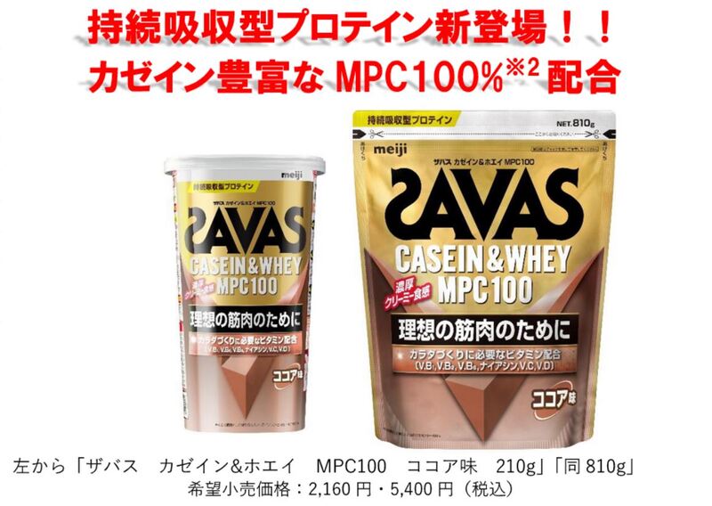 そこでこのたび、カゼインが豊富なMPCを、たんぱく質原料として100%配合した「ザバス カゼイン&ホエイ MPC100 ココア味 210g」「同 810g」を発売します。MPCに多く含まれるカゼインは、ホエイプロテインに比べて吸収が穏やかなため、アミノ酸の吸収が持続するのが