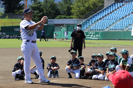今年で30年目を迎えるこの教室は、元プロ野球選手が講師を務め、毎年全国各地で開催されます(今年度は5か所を予定しており、第1回和歌山、第2回広島、第3回富山は終了。第5回北海道は11月5日に開催予定。)。寒河江教室には、少年野球チーム10チーム、小学生120、指導者21、保護者25のら合計166人が参加し、西崎幸広氏(日本ハムOB)、大久保博元氏(巨人OB)、井端弘和氏(中日OB)、鈴木尚広氏(巨人OB)ら元プロ野球選手の豪華講師陣により直接指導が行われました。