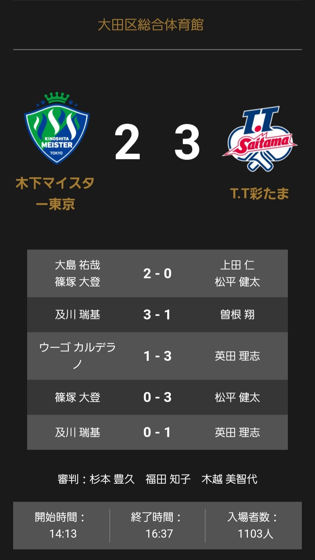 開幕戦は3-2でT.T彩たまが木下マイスター東京に勝利しました