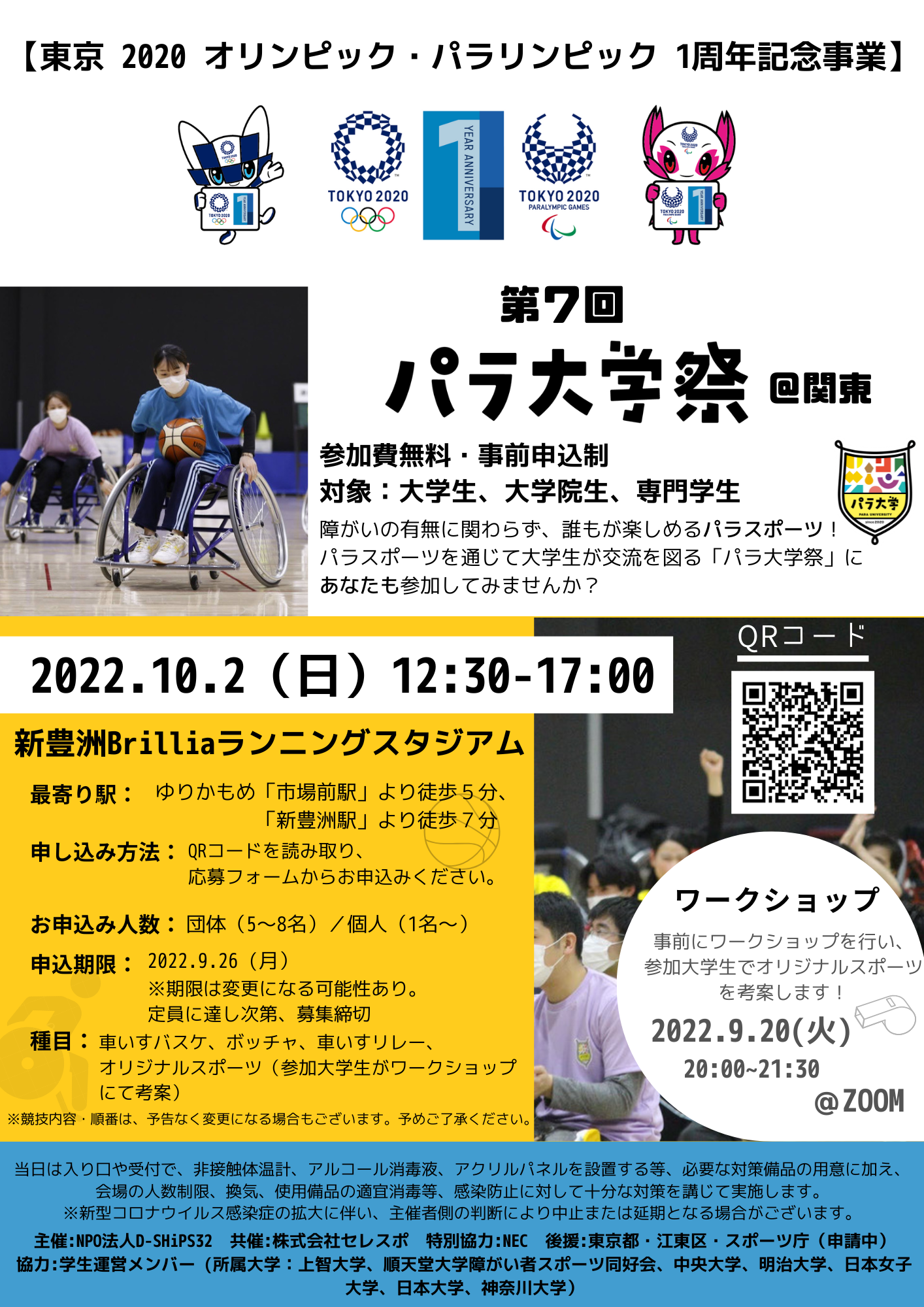 NPO法人D-SHiPS32【代表:上原大祐】では、大学生および専門学生を対象とした、パラスポーツイベント【パラ大学祭】を2022年10月2日に開催いたします。