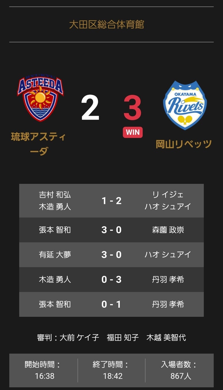 琉球アスティーダと岡山リベッツの試合は、3-2で岡山リベッツが勝利しました
