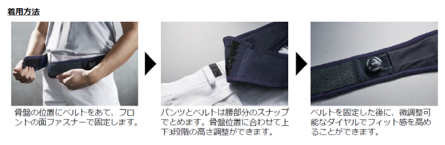骨盤位置に装着することで腰への負担を軽くします。さらにダイヤル式でワンタッチで「締める」「緩める」の調節が瞬時にできるBOA®フィットシステムを搭載。ベルトを外すことなくシーンや体調に合わせてフィット感を調節できます。
