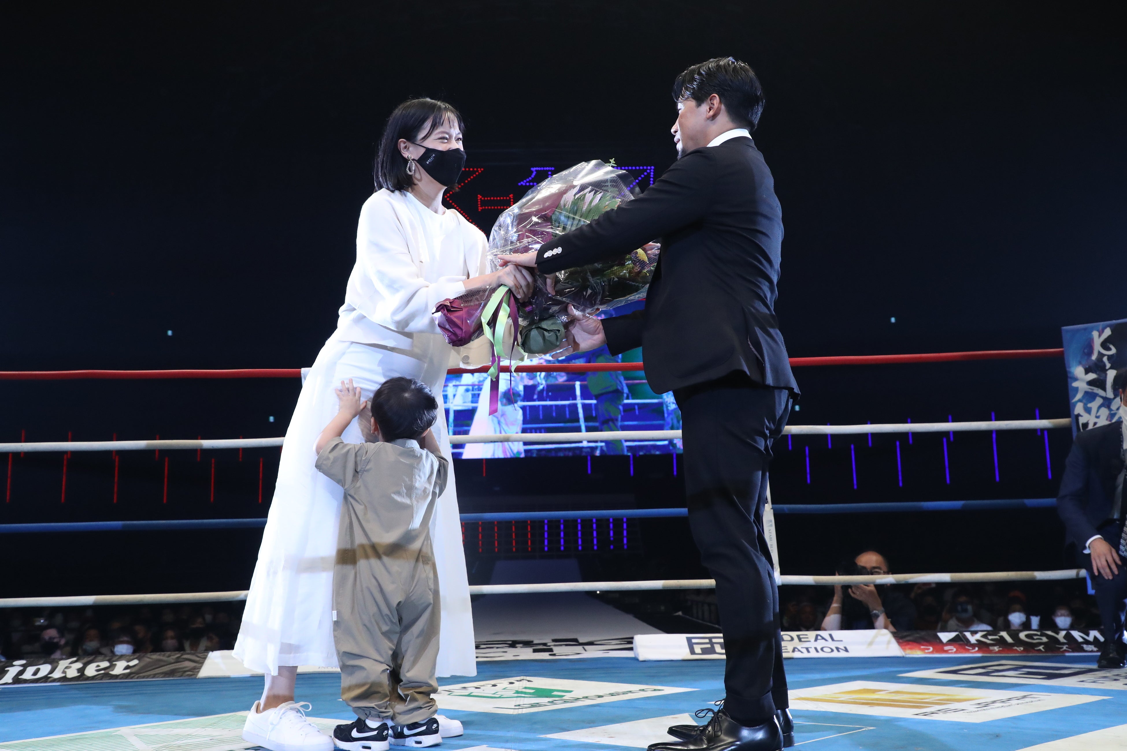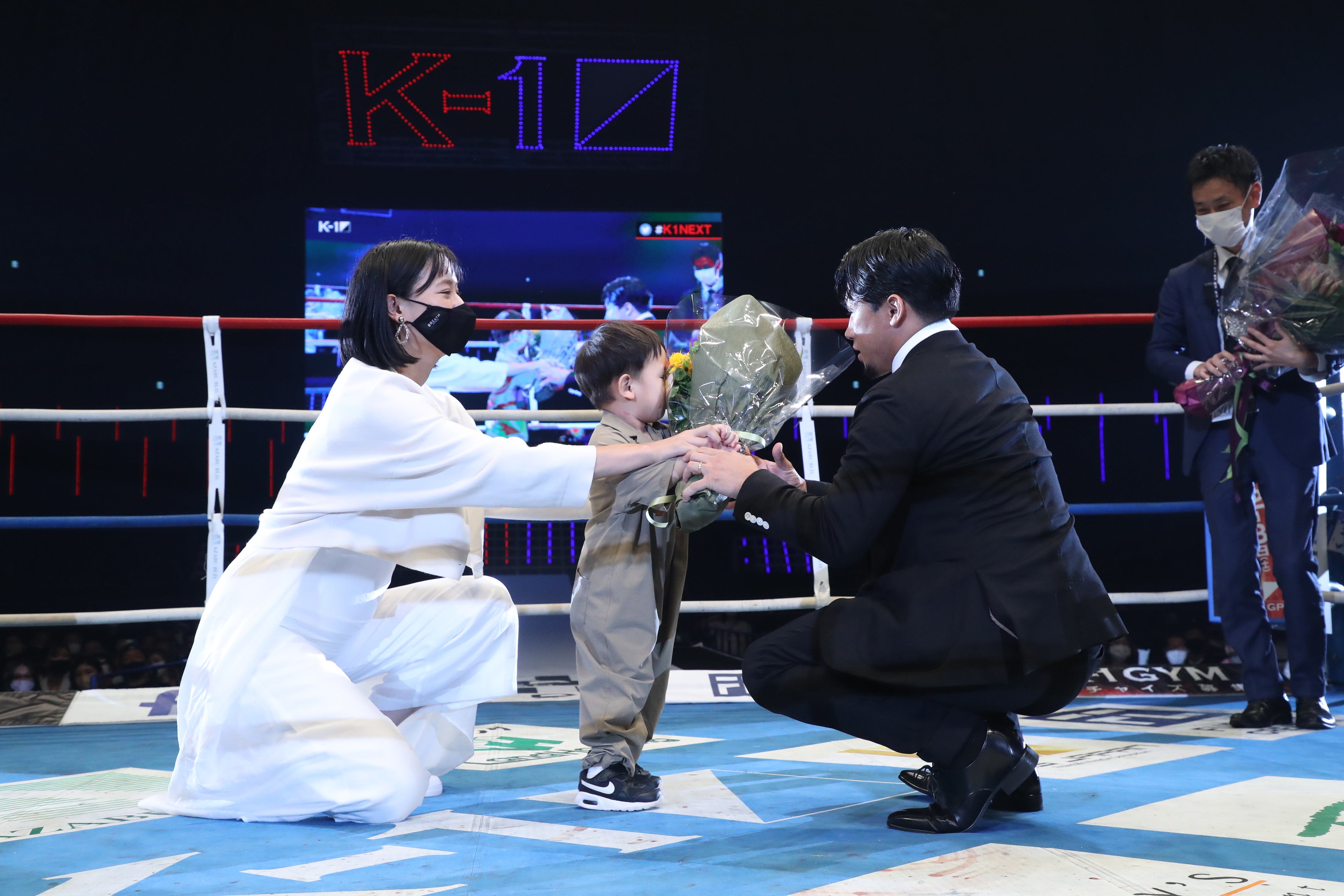 「夫のこれまでの選手生活をずっと応援してくださった皆様に心より感謝申し上げます。私たち家族にさまざまな景色を見せてくれた夫とK-1にも感謝です。やはり会場で引退セレモニーを目の当たりにすると込み上げてくるものがありますが、現役生活のうちのほんの5年間、夫のそばにいる中で格闘家としての在り方、生き様を見せてくれた夫を心から尊敬しますし、誇りに思います。」