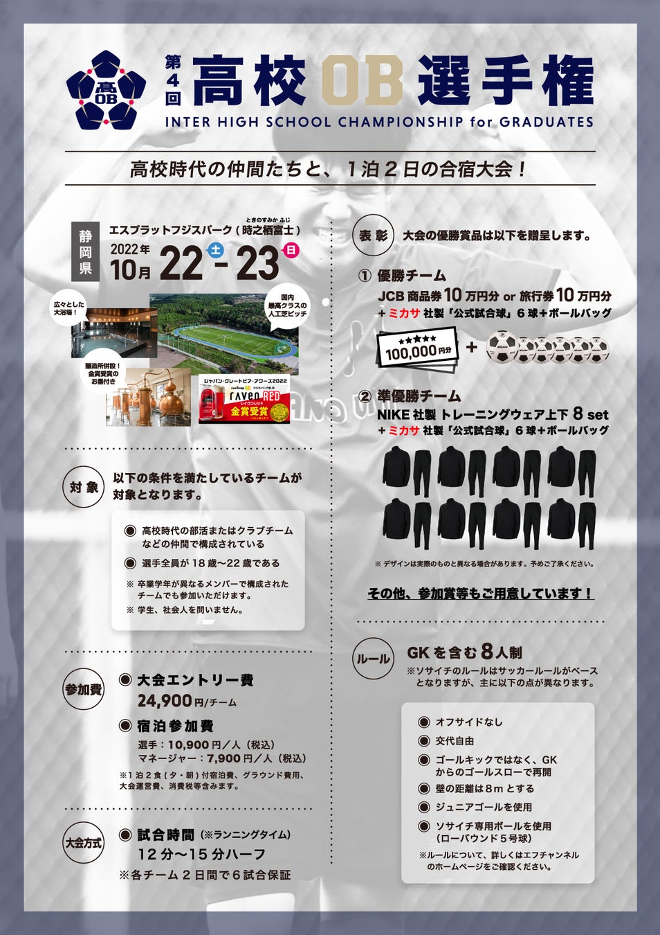 今大会はソサイチ(8人制サッカー)で行われ、参加資格は高校もしくはユースチームの同一チームのOBで構成されていることが条件となっている。