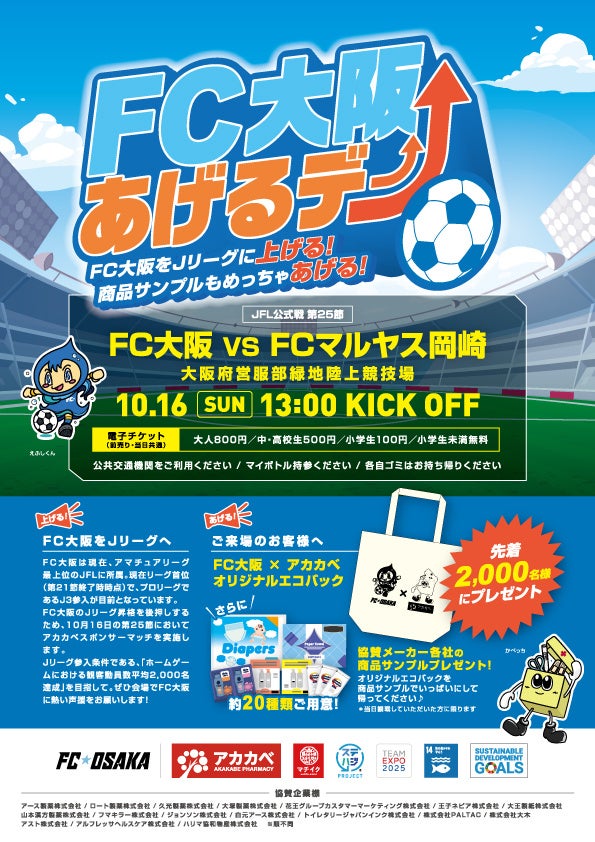 大阪府東大阪市をホームタウンとするサッカークラブ「FC大阪」は、FC大阪 地域貢献パートナーである株式会社アカカベ様にご協賛いただき、10月16日(日)大阪府営服部緑地陸上競技場で行われる、第24回JFL 第25節 FC大阪 vs FC岡崎マルヤス戦において「アカカベPresents FC大阪あげるデー!」を開催致します。
