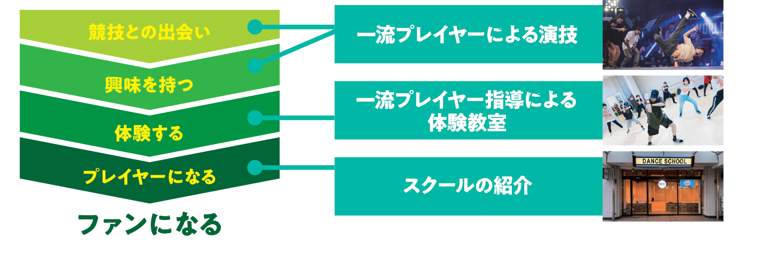 世界、そして日本国内でも普及を図るムーブメントが起きている中、「新たなファンの獲得と定着」はアーバンスポーツにとって最大のミッションです。本イベントでは、「競技との出会い→ファンになる」この流れを実現するイベント設計を行います。