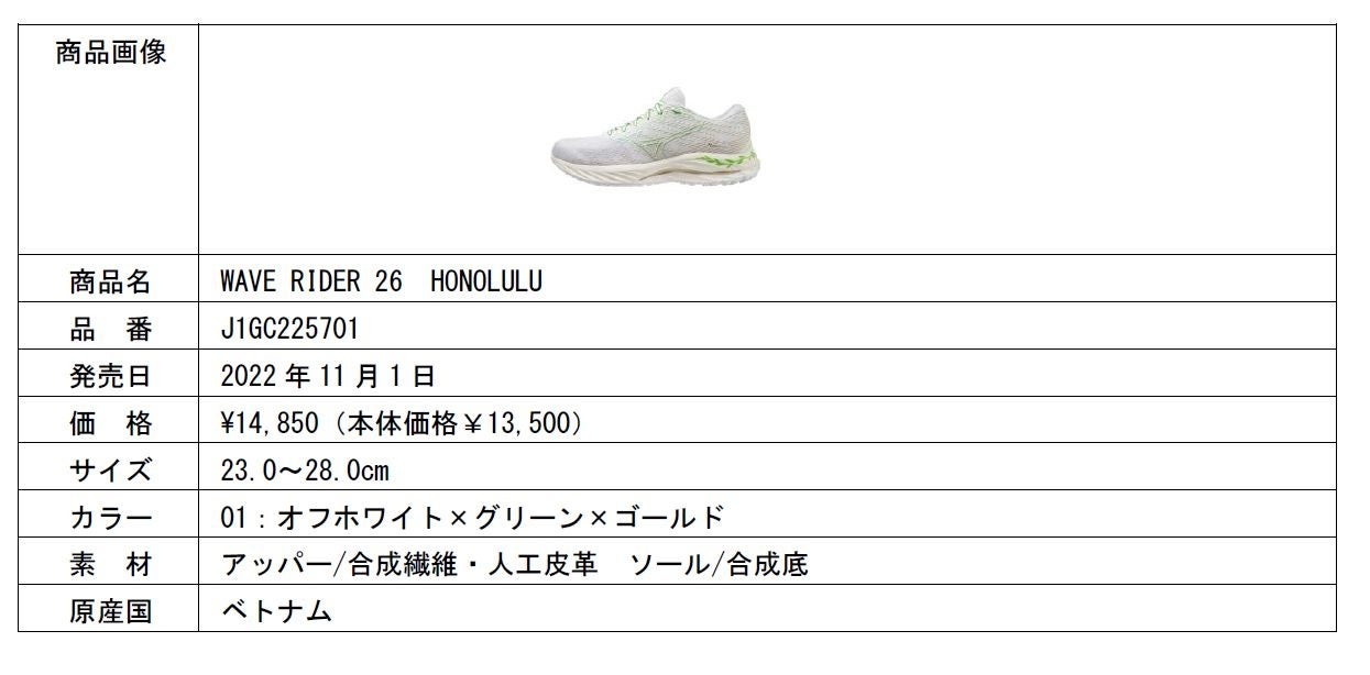 「WAVE RIDER 26」では、ホノルルをモチーフとしたカラーも発売します。カラーは、オフホワイトをベースにゴールドとグリーンをさし色にしながら、踵とベロ部にはレイをほどこしています。インソールも特別仕様です。