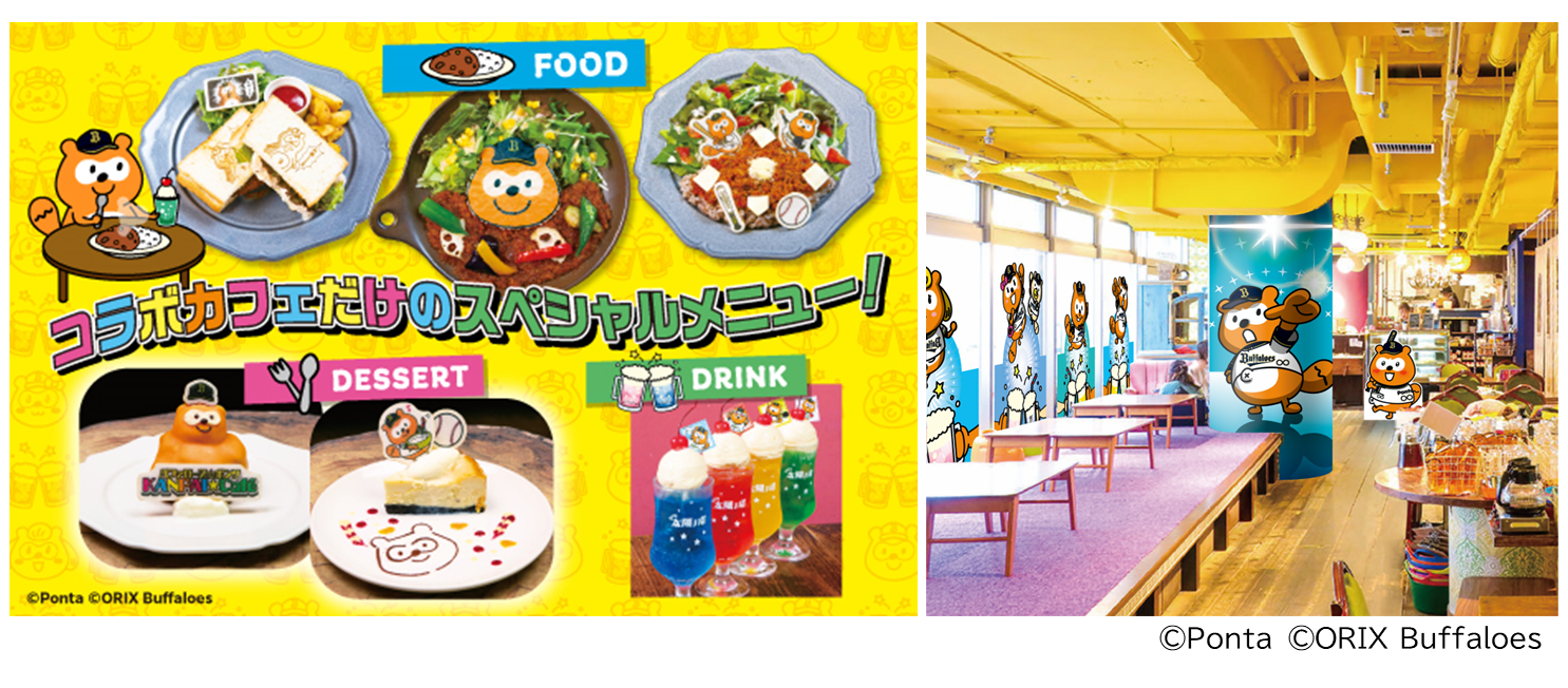 バファローズ☆ポンタをコンセプトにしたカフェでは、ここだけで味わえる限定メニューやカフェ開催記念グッズを販売します。限定メニューでは、バファ☆ポンをモチーフにしたドリンクやお食事、デザートの全9種類を提供します。「全員でKANPAIしてWおう」というテーマでデザインされた店内で、バファ☆ポンファミリーとの「KANPAI」が楽しくなるよう、色鮮やかなドリンクを4種類ご用意しました。お食事には、笑顔のバファ☆ポンが添えられた「一緒に食べてWおう!バファ☆ポンカレーライス」や、球場をイメージした「バファ☆ポンタコライス球場~カフェの陣~」などを提供します。また、たぬきケーキをバファ☆ポンバージョンにアレンジした、数量限定のケーキをお楽しみいただけます。