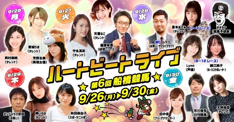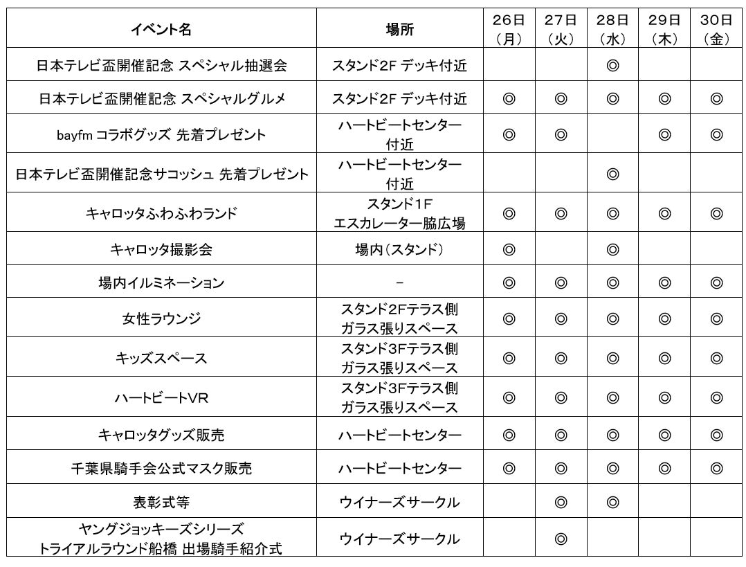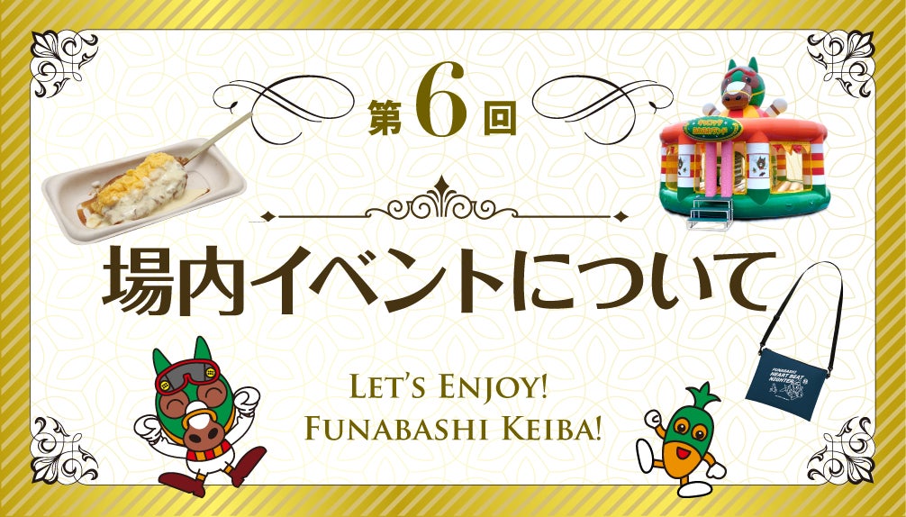 第6回開催も、キッズスペース、キャロッタふわふわランド、場内イルミネーションなどファミリーで楽しめる場内イベント、公式YouTubeチャンネルでの「船橋ハートビートライブ」場内LIVE配信など、楽しいコンテンツが盛りだくさん!さらに今開催は、スペシャルグルメの販売や、Amazonギフト券が当たるLINEおみくじ、千葉県産かずさ和牛が当たるTwitterキャンペーン等も開催します!また、9月28日(水)の日本テレビ盃(JpnⅡ)当日は、日本テレビ盃開催記念サコッシュの配布や、豪華賞品が当たるスペシャル抽選会等、この日だけの特別なイベントもお楽しみいただけます。第6回船橋競馬開催もどうぞお楽しみに!