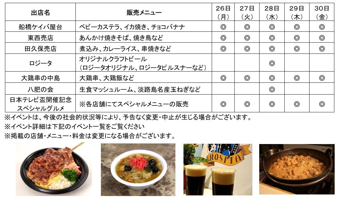 日本テレビ盃の開催を記念して、田久保売店の「レバータレ ネギのせ」、大鶏串の中島の「大鶏串(鶏の親子掛け)」、東西売店「月見チキン焼きそば」、マリリン船「有名銘柄ハイボール」などの特別メニューが登場します!各店舗のスペシャルメニューを是非お試しください!
