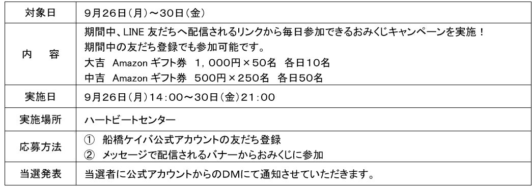 9月28日(水)の船橋競馬未確定勝馬投票券1,000円分(どのレースでも可)の提示で抽選会に1回参加。