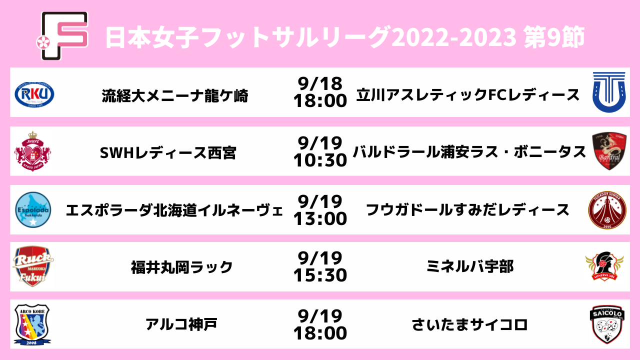 9月17日(土)から9月19日(月・祝)の3日間、西宮市立中央体育館/グリーンアリーナ神戸にて日本女子フットサルリーグ2022-2023 第8節・第9節を開催します。今シーズンもSPOTV NOW(登録・視聴無料)にて全試合をライブ配信いたしますので、ぜひご視聴ください!