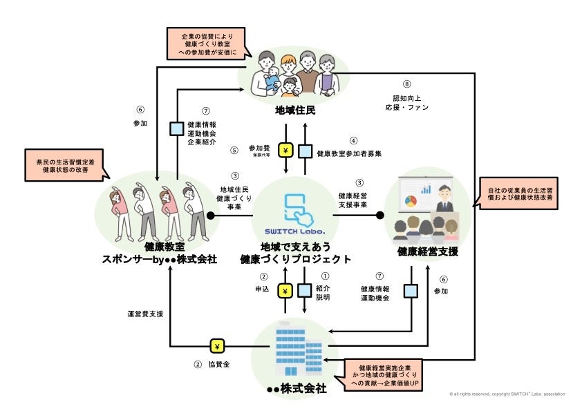 子供や主婦、高齢者など、健康経営では支援できない方たちの健康づくりを行うことも県民の健康づくり推進には重要な取り組みです。自治体等が行う健康教室に加えて、今回の仕組みでは企業が協賛する形の健康教室を開催する予定です。協賛金で運営を行うことで県民が無料もしくは安価に様々な健康教室に気軽に参加できる、これまでにない環境づくりを目指します。協賛企業は健康づくりのノウハウがなくても協賛金支援のみで地域住民のための健康教室を開催することが可能で、地域でのCSR活動やSDGsの「すべての人に健康と福祉を」への貢献になります。