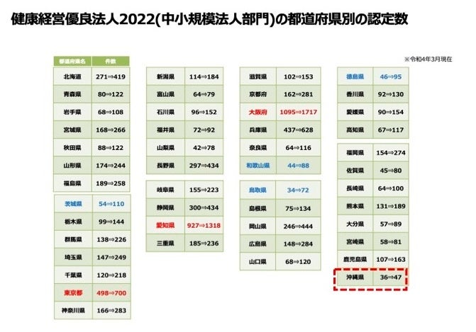 沖縄労働局によると令和2年職場における定期健康診断実施結果について、有所見率(69.5%※2)は10年連続全国最下位です。血中脂質が42.9%(全国平均33.3%)で最も高く、次いで血圧24.0%(全国平均17.9%)、肝機能23.9%(全国平均17.0%)の順となっており、食習慣、飲酒習慣、運動習慣、ストレスなどの影響があると考えられます。経済産業省が健康経営を推進するために「健康経営優良法人」の認定制度を2016年より行っている中で、沖縄県の企業で認定されている数は2022年中小規模法人部門で47社と全国ワーストです。(全国12,255社)
