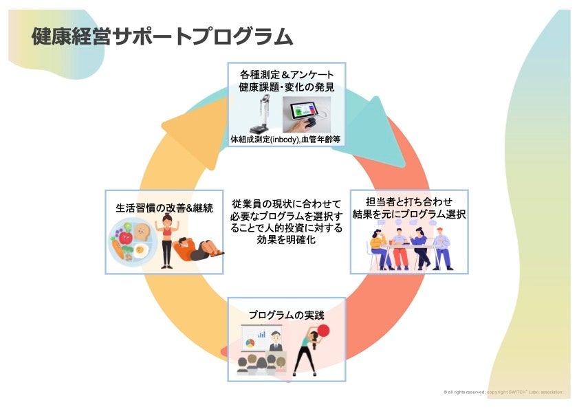 一般社団法人SWITCH Labo.(支店:那覇市、代表:久高 有加)は、企業が自社の従業員の健康づくりに取り組む「健康経営」を実施しながら地域貢献活動として、住民向けの健康づくりを支援する「健康教室」の運営を協賛する仕組みをリリースしました。令和4年度「スポーツアイランド沖縄」形成に向けた付加価値構築支援補助金を活用し、沖縄県民誰もが気軽に健康づくりやスポーツにアクセスできる環境づくりを目指します。肩こり腰痛改善・食習慣改善・睡眠改善・ヨガ・ピラティス・ストレッチポール・森林浴などの講座をラインナップとして提供予定です。また、体組成系Inbody(インボディ)や血管年齢の測定によって講座の受講による効果測定も実施予定です。