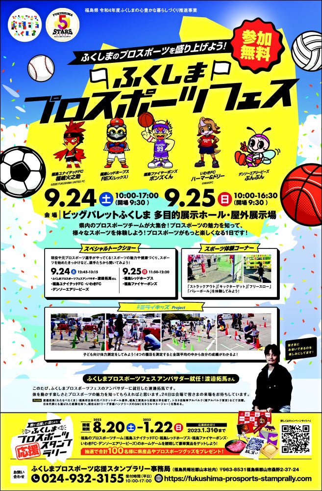 参加チームはサッカーの福島ユナイテッドFCといわきFC、野球の福島レッドホープス、バスケットボールの福島ファイヤーボンズ、バレーボールのデンソーエアリービーズです。キックターゲットやストラックアウトなどのスポーツ体験、選手らによるトークショー、子どもの体力測定、各チームなどのグッズが当たる抽選会が開かれます。参加無料で日時は24日が午前10時~午後5時、25日が午前10時~午後4時30分です。