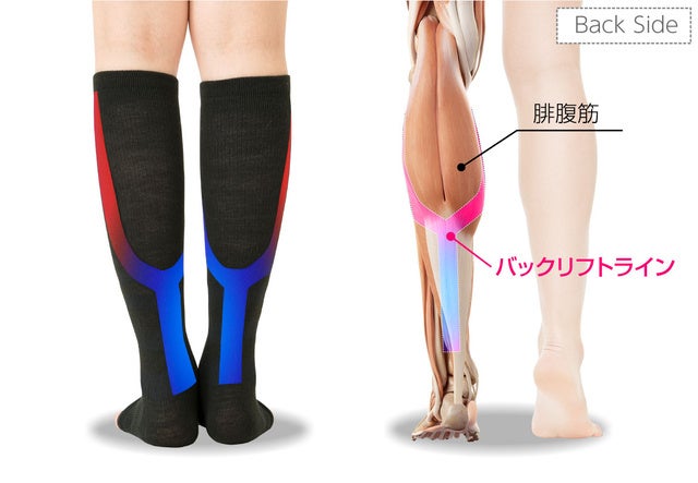 バックリフトラインがふくらはぎ(腓腹筋)のブレを抑制し、動きを柔軟にしてくれることで、安定感を与えます。