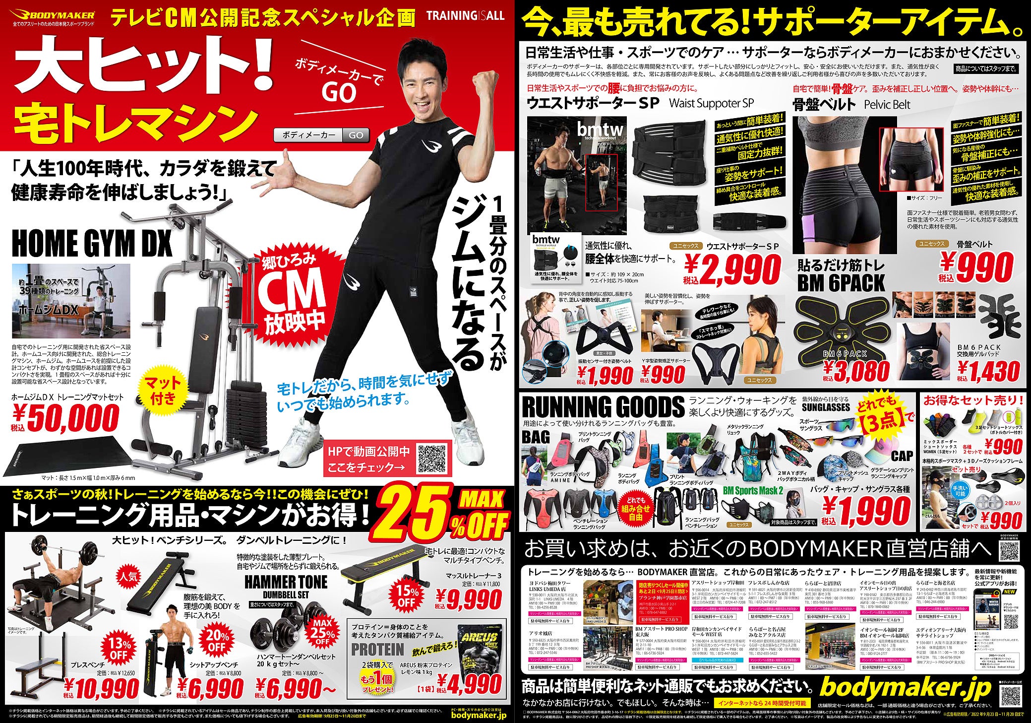 日本発のスポーツブランドBODYMAKER(ボディメーカー)は、スポーツの秋!応援!9月23日(祝)より全国直営店舗で「秋物先行セール」がスタートいたします。今年の中心は、機能性を追求した秋・冬物新商品や最大半額品多数掲載!数量限定目玉商品などお得な企画を数多く掲載しています。また、マシン・ウエイト商品なども限界割引額に挑戦しまた!めったにない買い時のチャンス到来です。今年もBODYMAKER(ボディメーカー)は、挑戦し続けます。ぜひ、ご来店、お待ちしております。