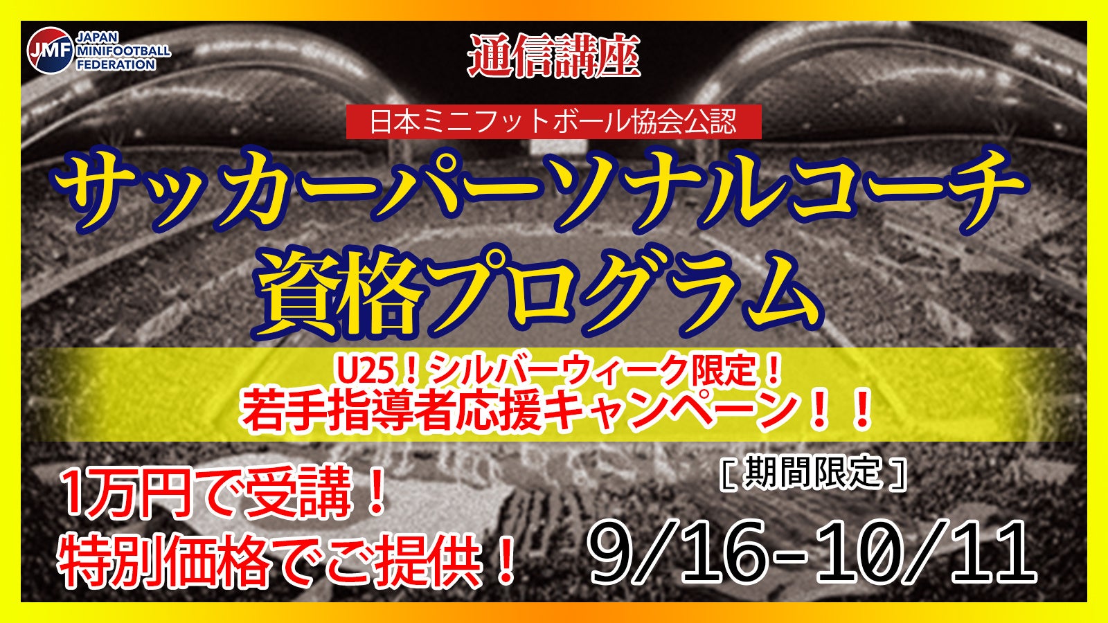 一般社団法人日本ミニフットボール協会(本社:東京都渋谷区、代表理事:櫛山匠)は、25才以下の若手サッカー指導者の応援として、シルバーウィーク限定で、サッカーパーソナルコーチ資格取得プログラムを1万円で受講できるキャンペーンを実施する。
